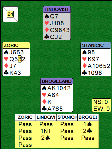 Slik det var fikk ikke Hoftaniska-Charlsen betet 3 grand ved det andre bordet etter hjerter ut til knekten som øst lot spillefører beholde for. Med beste motspill (double dummy) er det ikke lett å få tak i ni stikk, men i praksis rullet kontrakten hjem, Kroatia +400. Selv om Brogeland lurte til seg ti stikk i 2 spar ga det 6 IMP til Kroatia som ledet 35-29 på dette tidspunktet.