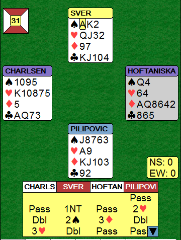 Sluttkontrakten er mildt sagt forferdelig. Med beste motspill blir det ikke mange stikkene til vest, det ser ut som minst fire doblede. Motspillet var imidlertid langt i fra full klaff, og Charlsen skrapte sammen seks stikk, -500, et stygt resultat (selv om det kunne vært verre) på det som normalt er en delkontrakt til N/S.