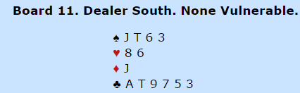 4 spar doblet stod som et segl. Merk at Ø/V har en glimrede hjerterkontrakt, og da Belgia var med til 5 hjerter doblet ved det andre bordet var gevinstspill sikret for Belgia. Spillefører gikk en bet etter spar ut til esset og hjerterskift som han slapp til nords konge. Ett stikk til i spar ga dermed beten. Likevel ga dette 11 IMP til Belgia, men det kunne vært mer. Om han hadde toppet hjerteren ville det blitt doblet utgang begge retninger, og +850 sammen med +790 ville da gitt 17 IMP til Belgia i to spill på rad mot Italia! Huttetu!