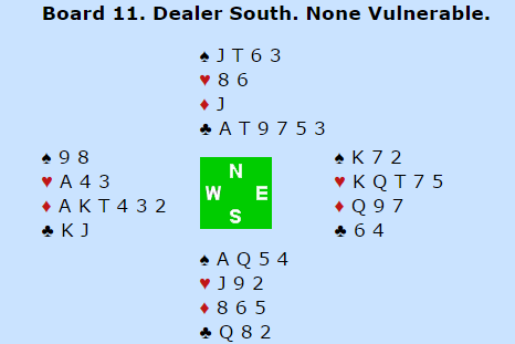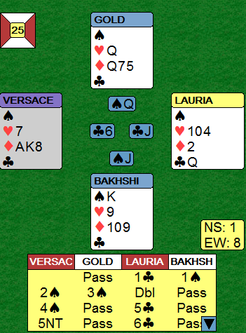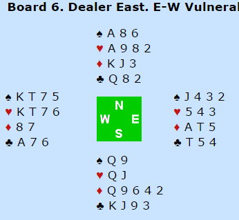 Ved det andre bordet kom topp-paret Gold-Bakhshi for høyt da de blåste ut i 6 grand. Syd spilte ut spar. Nå var det fryktelig enkelt for oss som så på, kløver tilbake og en bet. Så lett er det ikke ved bordet. Utspillet kunne sett fra nords synsvinkel ha vært unna spar konge, og i så fall har makkeren truffet blink! Det ble til at nord spilte spar tilbake, men da rasket Gold sammen tolv stikk på sekunder. Så til tross for at Norges Ø/V-par hadde gjort det riktige i meldingene tapte vi 13 IMP på spillet. Merk at spillefører hadde kun elleve stikk fra topp da han kom inn, men da hjerter satt 3-3 tok han resten (det var også en mulighet for hjerter-kløver skvis etter denne starten). Om 6 grand hadde blitt betet ville Norge vunnet 13 IMP i stedet, hele 26 IMP i sving i kampen Norge tapte med 21 IMP.
