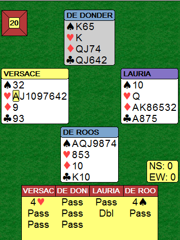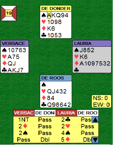 Belgiske De Donder sin dobling av 4 spar var ikke av type fornuftig - i teorien - han sitter jo på beit i den kontrakten. Slik kortene var kan ingen nekte Ø/V 4 grand! Å ta ut i 5 ruter når det var vest som ville bli spillefører (pga. Versace-Laurias spesielle Stayman-variant) var ikke tingen. 5 ruter ble (selvsagt) også doblet. Nord startet med tre store spar og ga syd en stjeling med en fjerde runde spar. Det var 500 allerede, og da Versace senere toppet trumfen ble det en ganske forsmedelig -800.