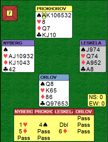 Nyberg tok naturlig nok ruterfinessen over syd etter spar ess ut til stjeling, men selv om den gikk galt vant han lett 6 ruter siden hjerterfinessen gikk bra. Dette kunne ikke Russland kopiere, og da de var i 4 hjerter med elleve stikk ble det redusering med 12 IMP, 25-18 etter syv spill. Tøff bridge av Finland!