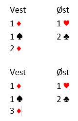 Ved det andre bordet åpnet vest med 1 kløver, og da nord ikke unaturlig meldte inn 1 spar var Ø/V så heldige at de ikke fant den 4-4 tilpasningen. De endte i 3 grand, og etter liten spar ut var det tolv toppstikk.Det trettende kom på en ganske automatisk tosidig skvis (nord må holde spar, syd må holde kløver, og ingen klarer å holde hjerter), Den varianten kan du eventuelt pusle litt med selv. Det ble +720 for tretten stikk, og det ga hele 17 IMP til Beliga.