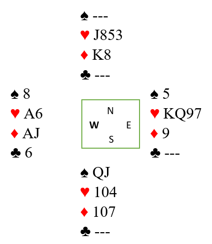 Ved fire av de syv bordene hvor 3NT var kontrakten kom hjerter ut, og da var det utgang til notering på sekunder. Ved de tre andre bordene kom ruter ut og N/S tok fem ruterstikk. Ved ett av bordene der nord traff ruterutspillet satt ROSENTHAL Ø/V og måtte tåle å gå en bet. Ved det andre bordet kom hjerter ut, 10 IMP til LANKVELD. Det var plutselig mye jevnere i kampen.