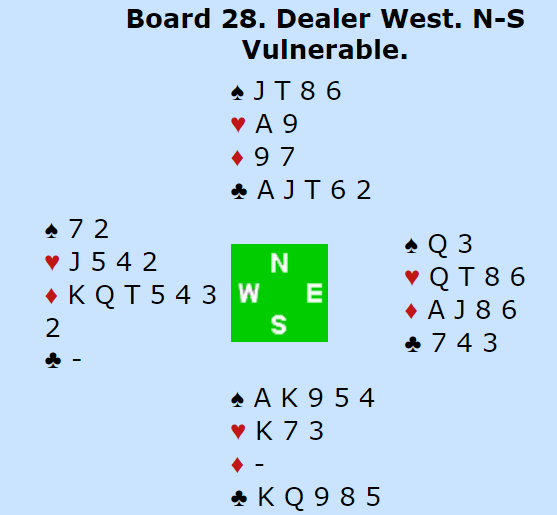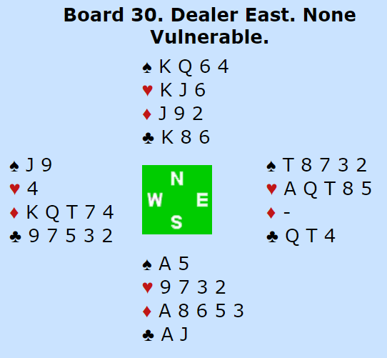 Det var jo en renons i kløver hos motparten, men det var ingen fare med syd som var spillefører i 7 spar og det var vest som var renons i kløver. Slik det satt var det ikke en gang nødvendig å gjette trumfen, tretten enkle stikk og +2210 til N/S. Ikke helt uventet ga den scoren 100%.