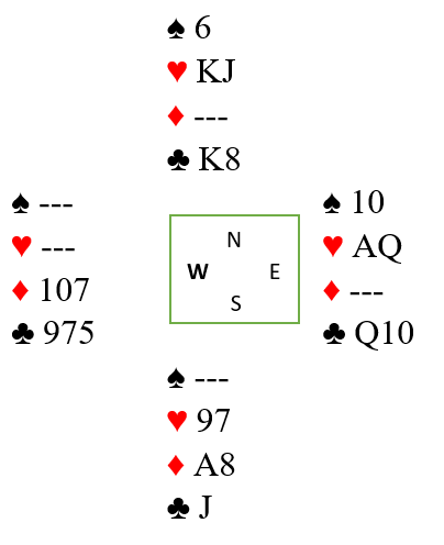 Så øst kastet kløver 10. Da spilte Ovesen kløver til kongen som tok med seg østs siste kløver. Så i trekortsposisjonen fridde spillefører seg med spar 6 til østs tier. Øst måtte avslutte med hjerter fra A-Q som ga Ovesen det niende stikket for hjerter konge. Elegant!