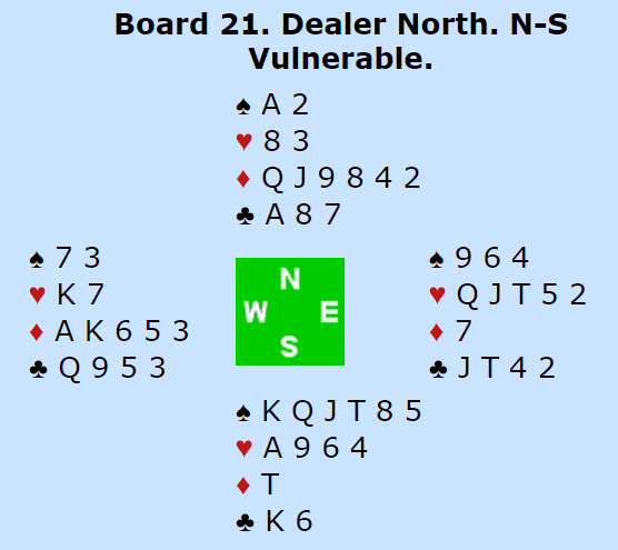 Bakke kunne se for seg omtrent hva slags kort syd hadde etter disse meldingene, og siden syd kravpasser/inviterer må han være renons i ruter. Bakke følte de trengte et godt spill, og han trodde at å spille mot 7 ruter ikke ville gi så bra score. Så han tok sjansen på 7 spar!