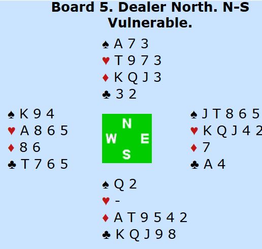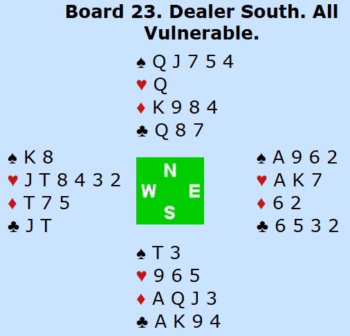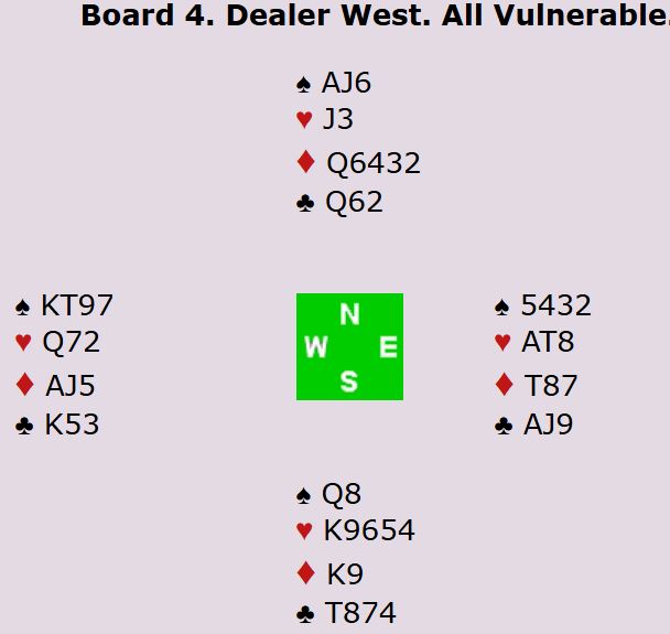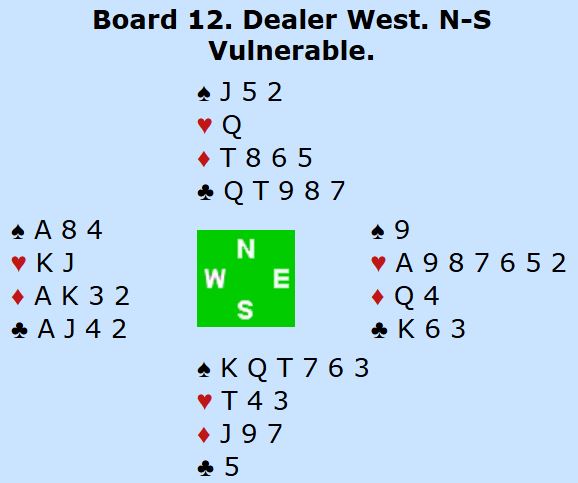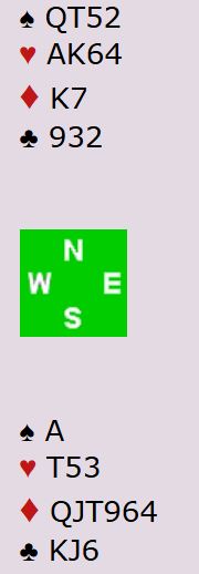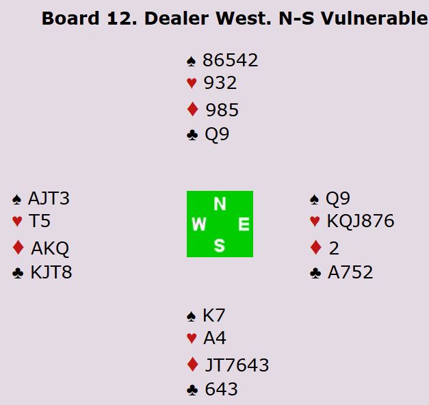 Tolv stikk og +1540 som var topp med sløyfe og 100% på spillet til De Botton-Charlsen! Men den sløyfen behøvdes ikke, 6 ruter meldt og vunnet ville også gitt 100%. Å få spille 5 ruter med tolv stikk ville gitt bra det også, 66,7%. Men øst meldte jo 5 spar over 5 ruter. Hvis N/S gir seg der, kanskje dobler kan de maksimalt få +300 for to doblede (en stjeling med hjerter fra nord) med to trumfstikk, ett ruterstikk og ett kløverstikk. Da må i så fall hjerterstjelingen finnes, men +300 ville gitt kun 33%, og de som ikke fikk mer enn 100 inn mot 5 spar satt igjen med fattige 12,5%.