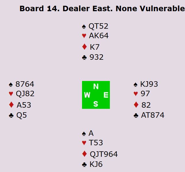 Et enkelt spill beviser ikke mye om hva som er best, men i dette tilfellet kom godt over en tredel av N/S-parene i 3NT som gikk helt galt, og de fleste av dem gjorde det etter åpning 1 kløver. Av dem som åpnet med 1 ruter klarte flere å finne den fine delkontrakten i ruter hvor det ble ni eller ti stikk, andre spilte delkontrakt i spar. Ingen fikk høyere score enn +140 på N/S.