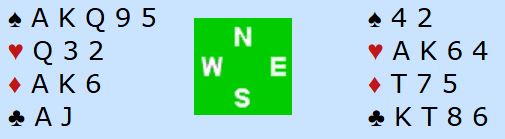 Vest åpnet med 1 kløver og fikk 1 hjerter til svar. Vest hoppet da til 2NT (18-19), og deretter presset øst på til lilleslemmen 6 hjerter.