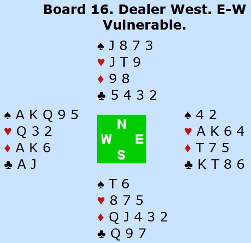 Uansett, mot Bakke-Brogeland ble nord spillende 1NT. Det gikk ikke bra. Det kom spar ut fra øst. Spillefører har to sparstoppere, men det er ikke lett å få mange stikk utenom det. Idet det ble spilt ruter til kongen og esset satte Ø/V opp sparen. Så var det omtrent slutt. Spillefører fikk ett stikk i ruter, for hjerter konge og to sparstikk – tre sonebet og ROSENTHAL noterte +300.