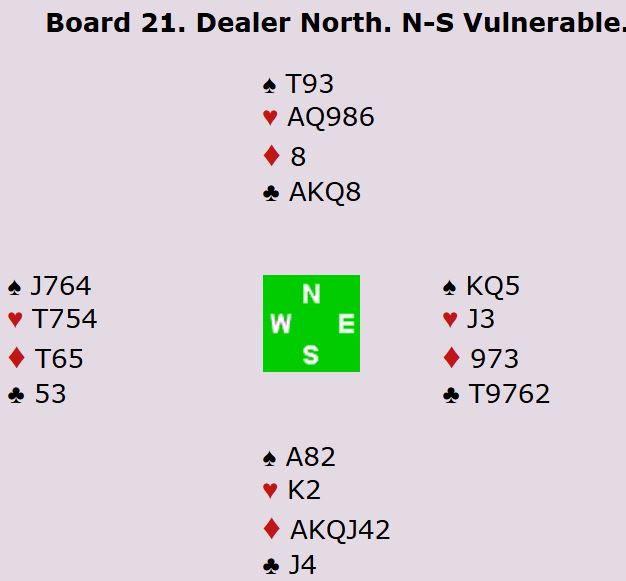 Alle fire Ø/V-parene var i 6 hjerter. Tre av dem fikk kontrakten på vest sin hånd, og det var mer komfortabelt siden sparen er beskyttet. Alle de tre som spilte 6 hjerter av vest vant tolv stikk.