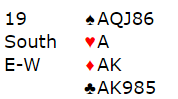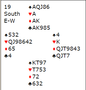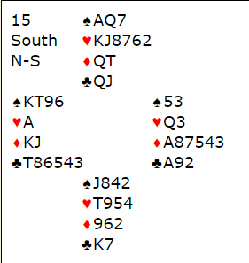Det er en ganske god, men hardmeldt slem. Hjerterfargen må ordne seg uten taper. Kløverfargen vil gi avkast for spartaperen. Hjerteren gir null taper om den sitter 2-2, eller man gjetter på finesse og lykkes (omtrent samme prosentsjanse), men også om damen sitter singel. Alt i alt så brukbare sjanser at det er helt greit å være i slemmen, greit å ikke melde den og.