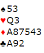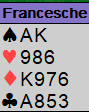 Et klønete påkast spør du meg, for om spillefører tror på det (at vest faktisk har A-K) så kan han spille på dobbel-squeeze ved å gi opp mellomruterne hos syd mot slutten! Han spiller seg da ned i denne posisjonen:.