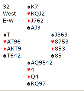 Det startet helt likt, spar konge i utspill og skift til trumf, så ble spar dame stjålet hos nord fulgt av halvmeteren med hjerter. Spillet gikk likt frem til sluttposisjonen, og stikket før våre firekorts diagram. På neste hjerter kastet også polakken….kløver dame! Forskjellen var at Klukowski (vest) aldri kastet noen kløverhonnør, så polakken på nords plass hadde ingen god grunn til å spille på dobbelskvis.