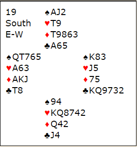 6 ruter er bra, men 6 kløver kanskje enda bedre da det vil beskytte hjerter konge mot gjennomspill. Det spilte ingen rolle, det var ikke for vanskelig å vinne slemmen slik det satt. Spillet ga 12 IMP til ZIMMERMANN og plutselig var stillingen i kampen uavgjort!