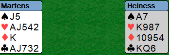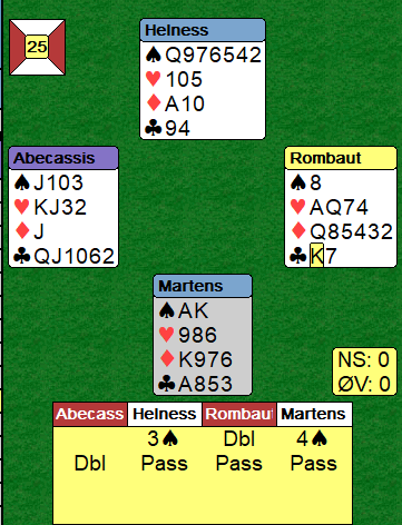 Martens hørte Helness åpne med 3 spar, og han stolte på at Helness i alle fall hadde noen verdier og en brukbar farge. Så han loftet til 4 spar etter dobler fra øst. Det ble kontrakten doblet da vest også avga en dobling over Martens melding. Slik så hele spillet ut: