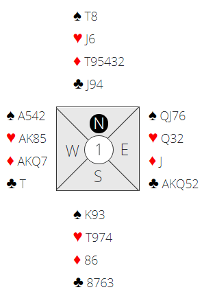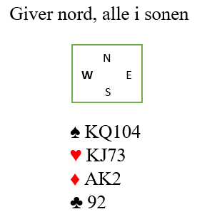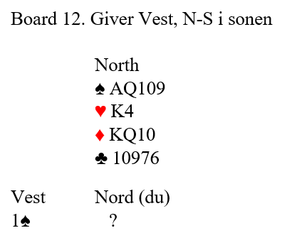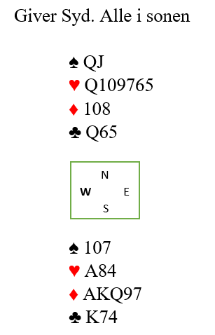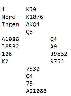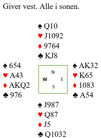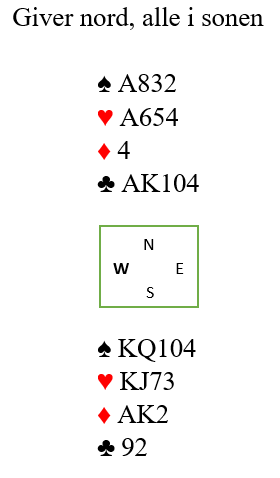 Nord har ikke så fantastiske kort, men sparen bør som nevnt være under kontroll. Siden syd ikke har en eneste ruterhonnør må hun ha meget sterke kort i kløver og hjerter. Det kan godt være nedlegg i 6 ruter, kanskje står det 7 ruter!