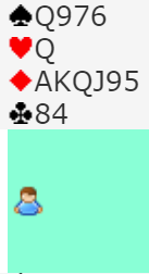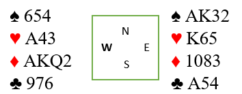 Makkeren viser tre nøkkelkort, altså har han spar ess, hjerter ess og kløver ess. Nå må det satses på slem. Og det må være en bra storeslem her om makkeren har spar ess, A-Q i hjerter og A-K i kløver. Det kan syd finne ut!