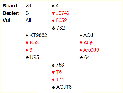 Syd overførte til hjerter og meldte så 3NT som ble kontrakten. Så de var i utgang helt bevisst meldt hvor det kun var 23 poeng til sammen! Og 3NT var det ingen problemer med å vinne!