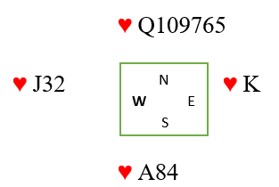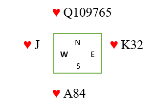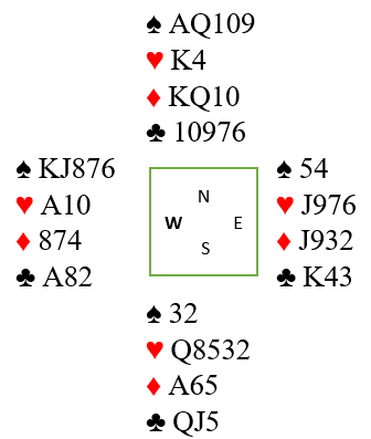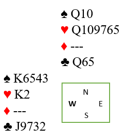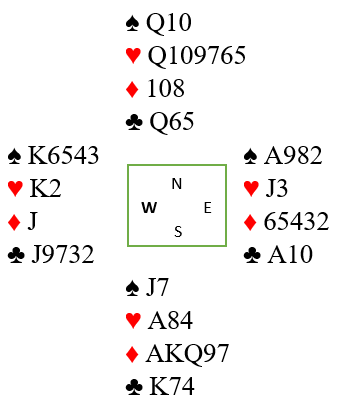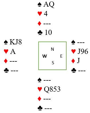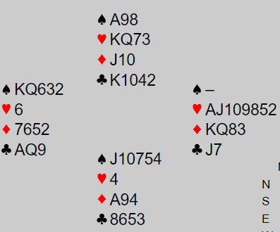 På dette tidspunkt hadde spillefører full telling. Vest hadde fem spar fra start, tre ruter, tre kløver og følgelig kun to hjerter. Et innspill i hjerter var helt safe.