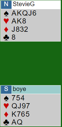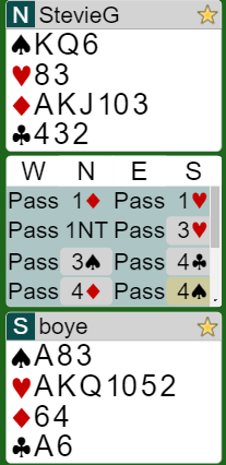 Uansett, kontrakten ble 4 spar spilt av nord ved vårt bord.