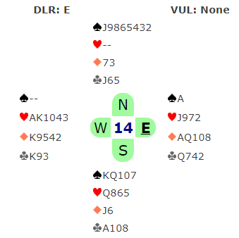 Et siste poeng i dette spillet er at Ø/V har en glimrende hjerterkontrakt. Da spillet forekom ga 4 spar med ti stikk en veldig god score til N/S. Det var ikke fordi det var så mange som gikk bet i 4 spar, men det var ganske mange bord hvor Ø/V fikk spille 4 hjerter! I den kontrakten sitter det glimrende, ruter konge i saks og kløver ess foran konge-dame. Det er kun tre tapere, en i spar, en i trumf (hjerter) og en i kløver. Det ble ved mange bord +620 til Ø/V!