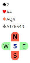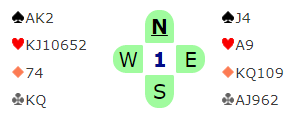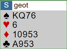 I det neste spillet handler det litt om kortvurdering i meldingene, men også om spilleføringen i de mulige kontraktene. Først syds melde"problem":