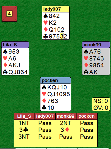 Øst får både for kløver konge og kløver dame i neste stikk, og nord vinner med kløver ess i tredje stikk. Vest hadde dobbel kløver fra start og kastet en spar i tredje kløverrunde.