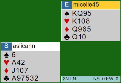 Det kjedelige for spillefører er at hun ikke trygt kan få lagt ned en hjerterhonnør først og så eventuelt ta finesse over syd som åpenbart er favoritt til å ha lengde i hjerter, for det er ikke noe sikket inntak til øst. Hvis det spilles for eksempel hjerter til esset må det i så fall spilles en andre runde ruter for å komme inn igjen på østs hånd, og det er sannelig ikke sikkert går bra med ni ruter til sammen (selv om det her faktisk sitter 2-2 i ruter).