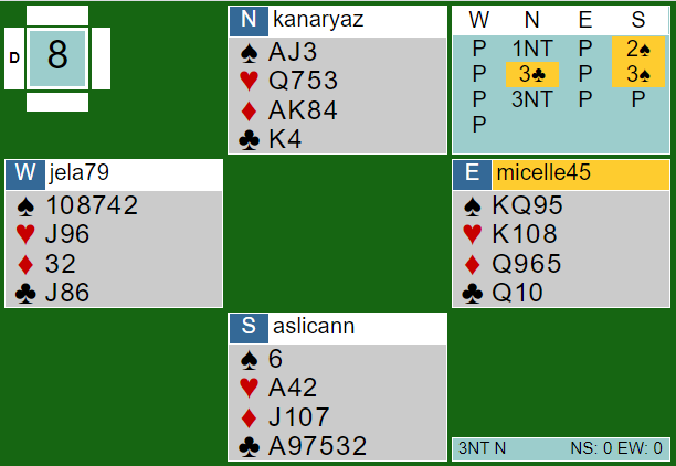 Gary Donner fikk spar 8 ut mot sin 3NT. Han lasjerte som kanskje ikke er best her (?), og syd vant det første stikket. Hjerter dame kom tilbake, lasjert, og neste hjerter ble vunnet med esset. Siden kløveren ikke satt var det båre åtte stikk fra topp. Da spillefører tok alle sine sidestikk før han forsøkte ruterfinessen i et forsøk på å vinne ni stikk fikk han ikke flere stikk, heller ikke for den andre ruterhonnøren sin, og kontrakten gikk to bet.