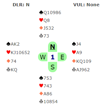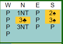 Her meldte det norske paret godt. Syds 3 hjerter over gjenmeldingen 1 NT var "suit-set", dvs. svarhånden sier at hjerter er trumf, og han er sleminteressert. Hvis man vil invitere til utgang gjøres det via 2 kløver (XY).