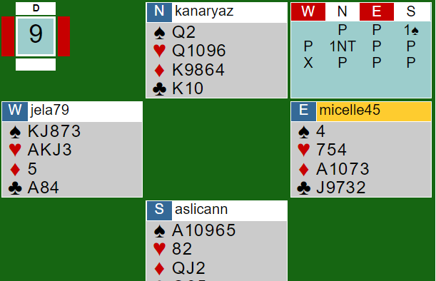 Ved det andre bordet åpnet ikke DONNER sin spiller med 1 spar, men med en 1 sterk, kunstig kløver. Dermed kunne ikke nestemann doble opplysende, og de var «out of the woods».