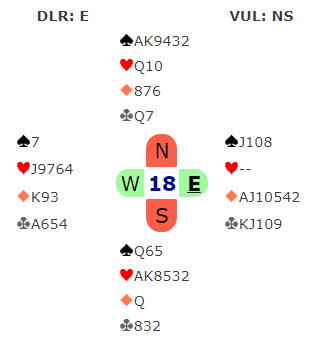 Elleve stikk i 4hjerter ga en smått utrolig +650 til N/S som sammen med +800 i favør lagkameratene Ø/V ved det andre bordet var verd hele 16 IMP.