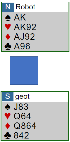 Du sitter nord og er giver, N/S i sonen, og motstandere er Jessica Larsson (vest) og Geir Helgemo.