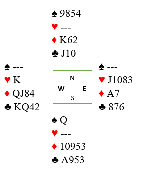 Hvis hun skifter til ruter 3 går det ruter 10 og damen fra øst. Idet øst spiller liten ruter tilbake til kongen og vest så spiller ruter 9 blokkerer spillefører for østs to siste ruterstikk ved å legge lavt fra J-5 gjenværende. Øst har jo A-8-7 bak og stikker han over vests nier står jo nords knekt. Og legger han liten ruter er ikke hans kort interessante lenger!