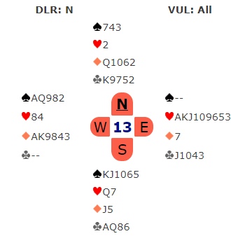 Larsson-Helgemo meldte 7 hjerter. Hvis det ikke kommer trumf ut er det fort tretten enkle stikk. To av øst sine kløvere kan trumfes og de to andre kastes på ruter konge og spar ess. Slik så hele spillet ut: