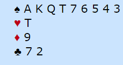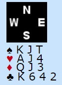 Syd har åpnet med 1 hjerter, minst femkorts farge. Senere har han vist firekorts spar og en god hånd med tre nøkkelkort med spar som trumf (essene og trumf konge).