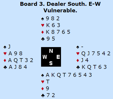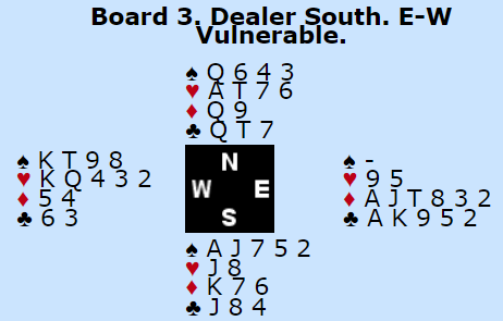 Ved det andre bordet stod Bogø-Sivertsvik sine lagkamerater på til storeslem. Det valgte å spille 7 spar som kan ha noen små tilleggsjanser i forhold til 7NT da det kan trumfes ruter hos vest, kanskje et par ruter hvis trumfen (spar) sitter 3-3 og kanskje få godspilt ruterstikk slik at det kan bli tretten stikk selv om kløverfargen ikke sitter jevnt fordelt. Men i 7 spar fikk spillefører seg en meget kjedelig overraskelse da spar dame ble spilt, en sjelden trumfsits med syvkorts tilpasning hvor Ø/V rår over de fem høyeste sparene :