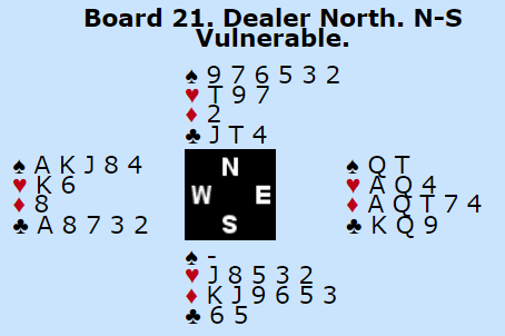 Jeg har ikke fått fatt i meldingene i GILLIS sin kamp, men i alle fall fikk Fuglestad-Sælensminde som N/S spille 5 spar doblet. Det burde blitt -300 om Ø/V tar sine stikk, en god stamp da Ø/V enkelt vinner 5 kløver eller 5 hjerter. Men i 5 spar doblet endte med elleve stikk, +650! Vest må ha håpet på to kløverstikk også om syd (skjulte kort) satt med kløver konge og derfor ikke skiftet til kløver, og så fikk ikke Ø/V noen stikk i den fargen i det hele tatt, syds kløvere forsvant på de røde kongene.