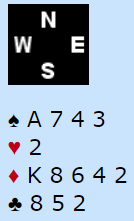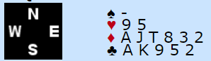 Her er det ingen i sonen som nok gjør det litt mer fristende å melde enn om man er i sone, kanskje ugunstig sone. Mange vil kanskje melde utenfor sonen med dette, men ikke gå inn med 1NT i sonen.