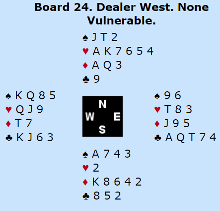 Toppen Ø/V gikk til et par som meldte og vant 6 kløver selv om de mangler to ess. Det var en god del 3NT-kontrakter som føk hjem selv om det der altså er mulighet for tre bet. Det er 5 kløver som alltid står. Et par steder ble 5 kløver doblet.  Både Nystrøm-Helgemo og Edgtton-Whibley satt N/S og så på at Ø/V meldte 5 kløver og tok elleve stiikk. For N/S ga -400 42%.