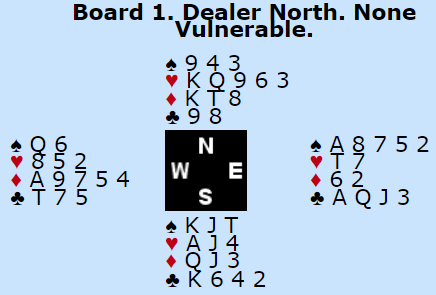 Og det skulle vise seg at N/S har kun ni stikk i sparkontrakt, Ø/V hadde fire sikre stikk å ta. Slik så hele spillet ut: