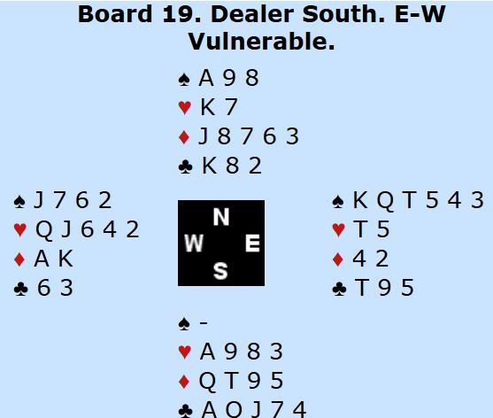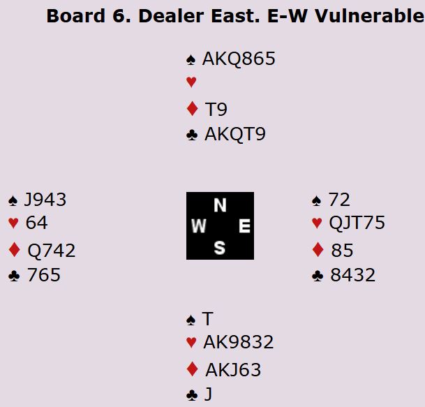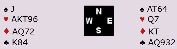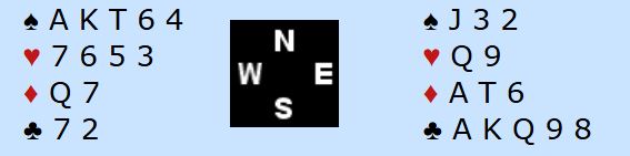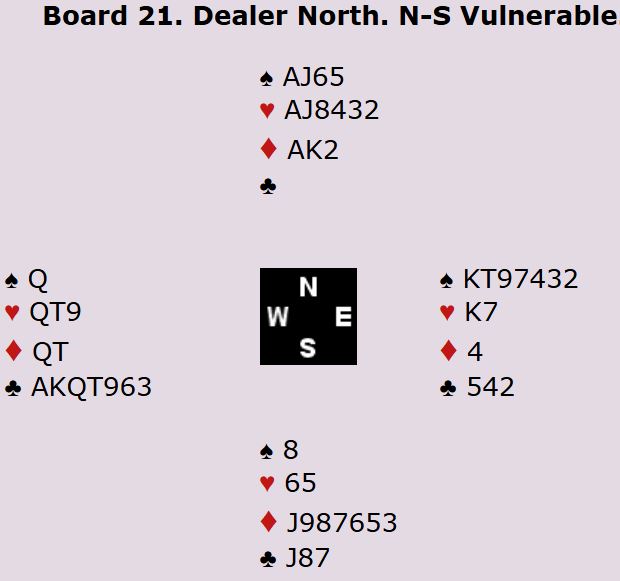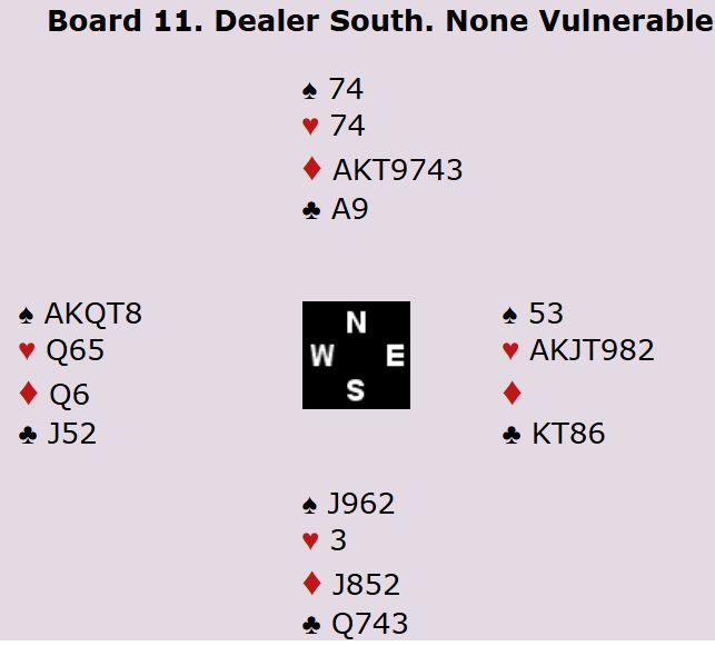 Som du kan se har N/S syv ruterstikk og to ess i motspill. Hvis de hadde fått tak i stikkene sine ville det blitt fem doblede bet, +1100 til N/S. I så fall ville Danmark tapt spillet med 10 IMP.