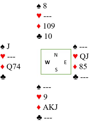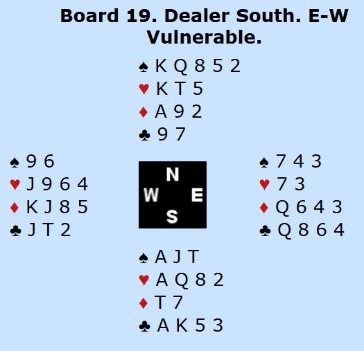 Ved nesten alle bord ble det spilt 4 hjerter som er en grei utgang, avhengig av kløverfinessen gjennom syd som åpnet med 1 ruter stort sett ved alle bord. Så meldt og vunnet +620 kan man ikke regne med å vinne noe på, det er vel alltid et buttspill? For hva kan gå galt for Ø/V her?
