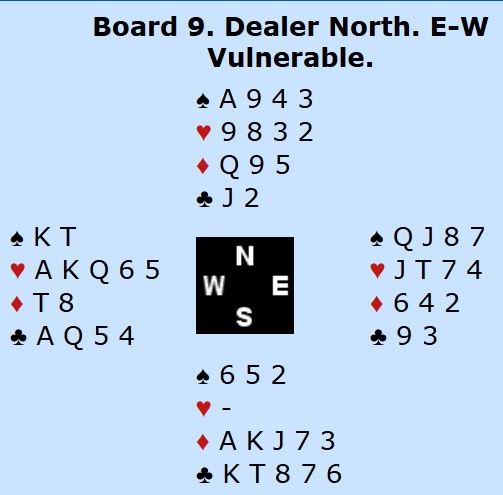 Ved det andfe bordet ble øst (Kvangraven) spillefører. Syd spilte ut kløver! Dermed var det elleve enkle stikk, Norge +650 og 13 IMP inn.