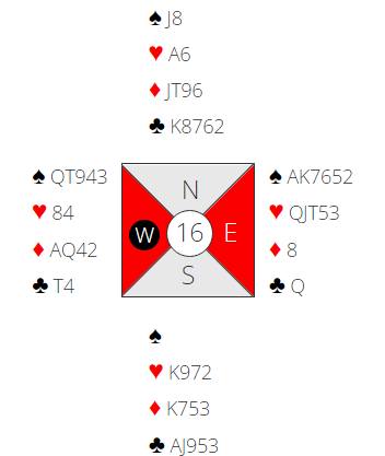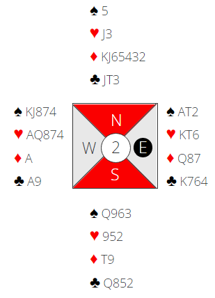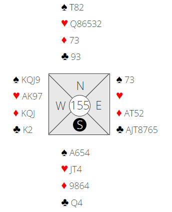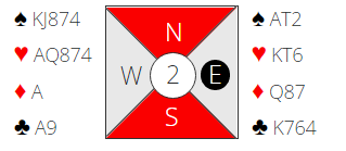 Vest hadde fått utlevert en flott vifte i dette spillet. Etter sterk, kunstig 2 kløveråpning melder vest hjerteren, antagelig to ganger, og havner i 4 hjerter til slutt. Nord spiller ut kløver dame.