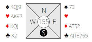 Det er ikke unaturlig å havne i 6 spar eller 6 hjerter her. Det er en god slem, og siden jeg kan fortelle at hjerterfargen sitter greit handler det om tolv eller tretten stikk. Og det er valget i spar som her avgjør mange parturneringspoeng.