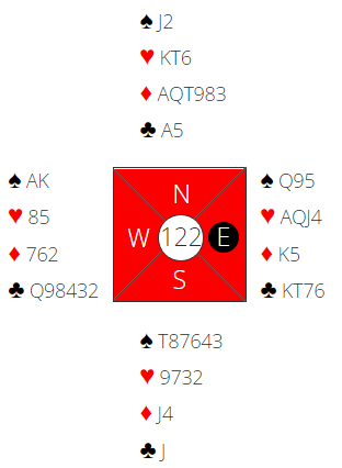Berset-Ekren var ikke heldige her, de satt N/S mot 6NT. Nord fant spar ut som var det beste de kunne gjøre, men å holde kontrakten på kun tolv stikk og -990 ga likevel -10 til N/S.
