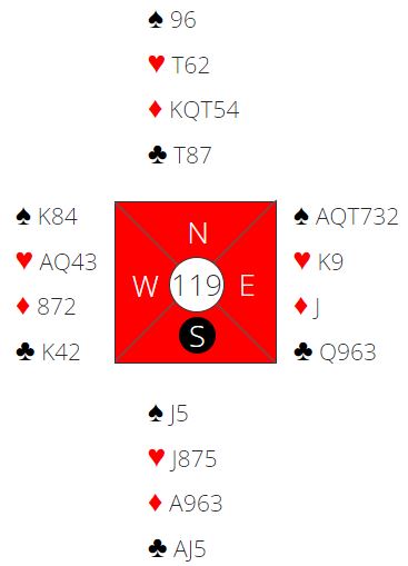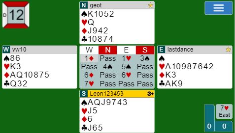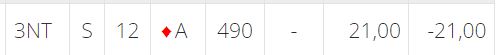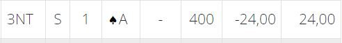 De som stoppet i 5 kløver fikk litt under middels da det var noen som spilte 3NT, og de fikk litt over middels. Noen få par var i 7NT og gikk bet.